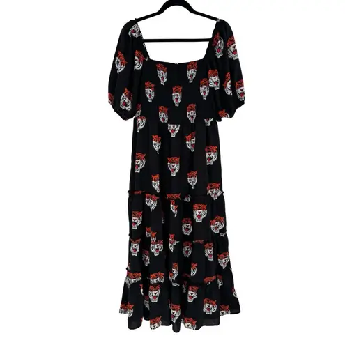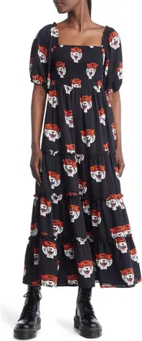 Signature orange tiger head pattern throughout Black background Stretchy smocking across the chest Stretchy puff sleeve Tiered design with ruffles at the seams Midi length Babydoll silhouette Stretchy square neckline Side seam pockets Fully lined Retail: $136 Size: XL (14-16) Bust: 15" (Stretching to approx 19.5") Length: 53" Influencer, statement piece, homecoming, graduation, tailgate, football, mascot, collegiate