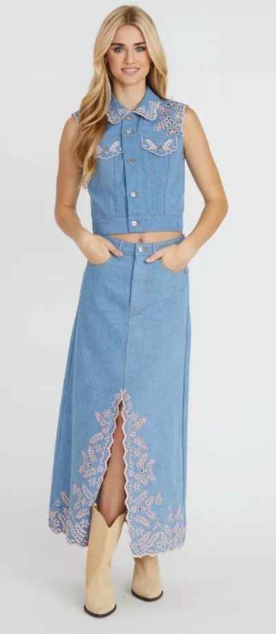 Delicate pink floral cutout embroidery on the collar, shoulders, and pockets, giving this vest a romantic, feminine touch. The classic button-up front and tailored fit create a flattering silhouette, while the embroidered details add a unique softness to the rugged denim. Perfect for layering over dresses or pairing with high-waisted jeans, this vest brings a vintage-inspired elegance to any look. 99% Cotton 1% Spandex Model is wearing size S