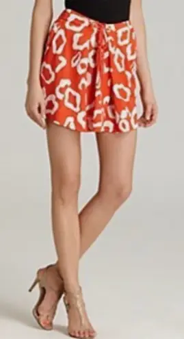 Coral red jersey mini skirt with white fantasy leopard pattern and self-tie string at waist. Folds o... Show more