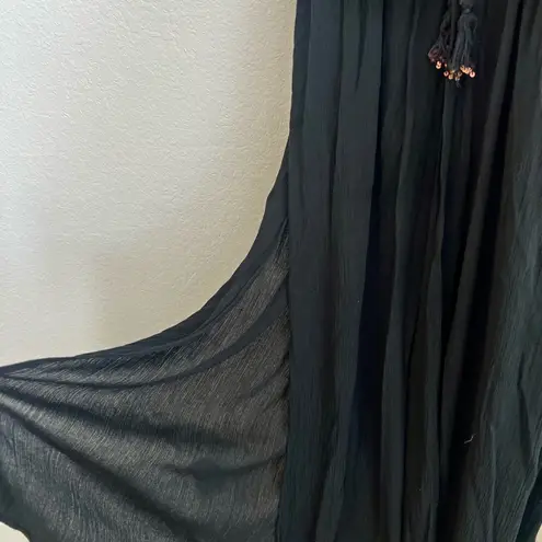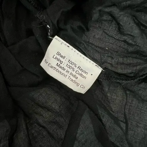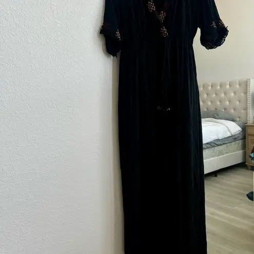 Deep V black maxi dress with orange accents by Earthbound. Features short sleeves and a relaxed fit... Show more