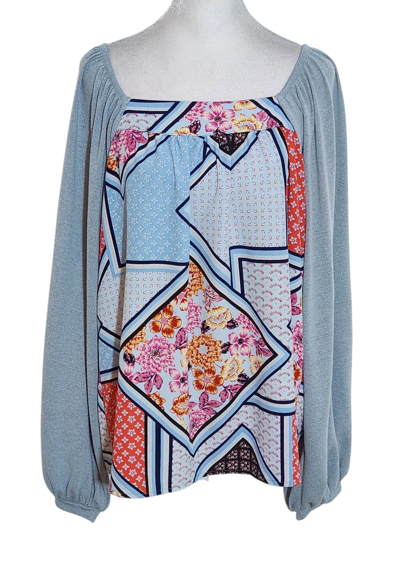 Easel boho blouse with two different types of fabric. The sleeves are very full and have a distresse... Show more
