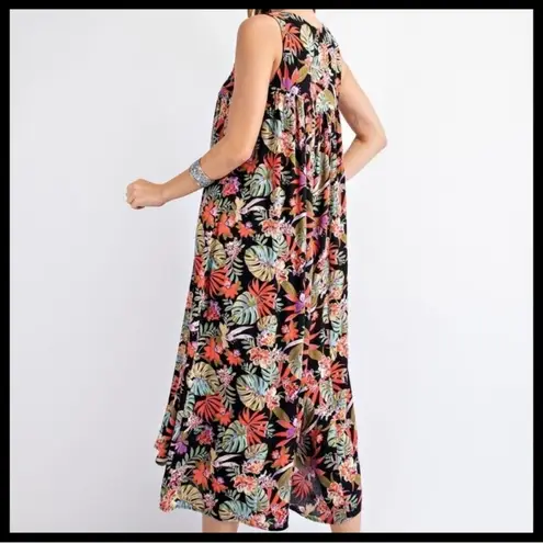 Tropical print maxi dress with vibrant colors. Sleeveless design for a breezy feel. Ideal for casual... Show more