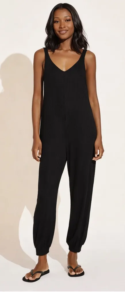 This Eberjey Elon Bound jumpsuit features a relaxed silhouette with a flattering V neckline and soft textured fabric for effortless comfort. Brand: Eberjey Style Name: Elon Bound V Jumpsuit Size: Women’s Medium Color: Black Style: Sleeveless jumpsuit Neckline: V neck front and back Fit: Relaxed tapered leg Features: Pull on style, lightweight textured fabric, cuffed hems Inseam is 29 inches Condition: Pre owned in excellent condition with no rips stains or holes Style Tags: #LoungeChic #MinimalComfort #EffortlessStyle #ModernRelaxed #EverydayEase