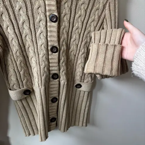 Eddie Bauer tan button up sweater with a collar and chunky knit detailing. Small snag on the back as... Show more