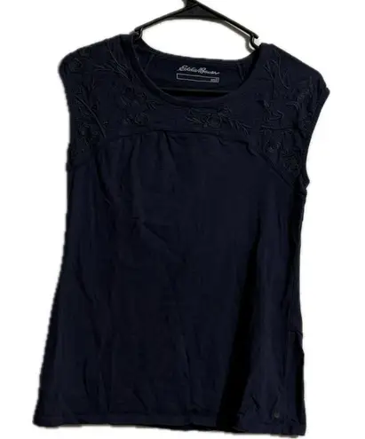 This elegant black blouse from Eddie Bauer features a sleeveless design and a round neckline, crafte... Show more