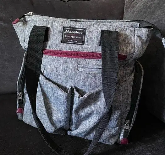 Gray and black diaper bag | tote Measures 14” by 16” with a 6” base Offers insulated side zip bott... Show more