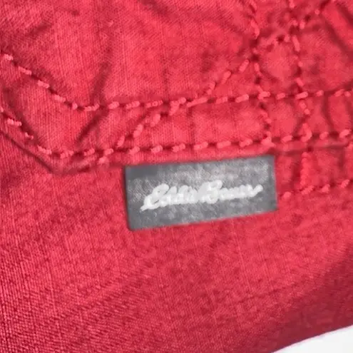 Keywords: Eddie Bauer, utility jacket, red jacket, cotton jacket, lightweight jacket, button up jacket, womens jacket, casual jacket, outdoor jacket, travel jacket, size M, drawstring waist, chest pockets, spring jacket, fall jacket