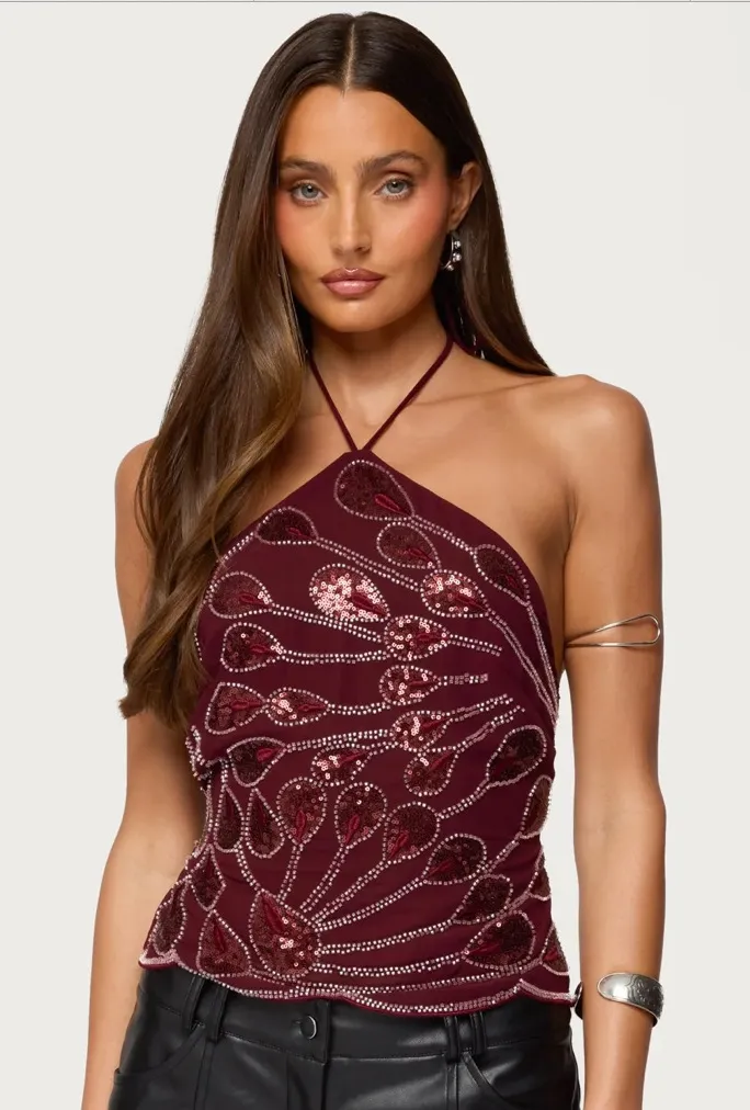 Edikted Embroidered Bead & Sequin Halter Top Red - $30 - From Haleigh