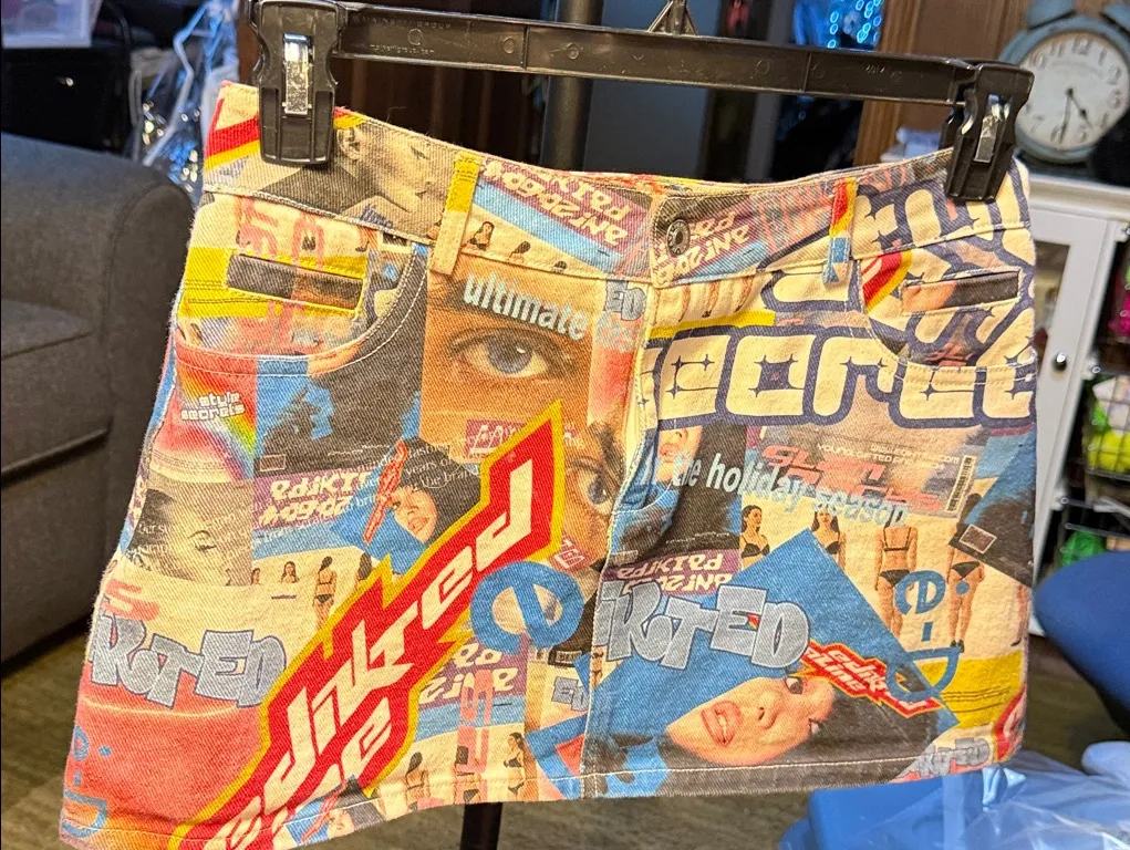 Vibrant mini skirt with bold graphic print. Features a mix of colors and eye-catching design. Perfect for a standout look. This is a beautiful skirt. The waist is a total of 30 inches. The length of the skirt is 13 inches.