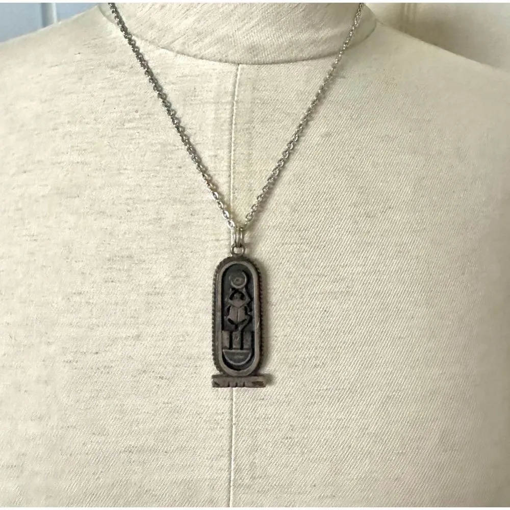 Egyptian cartouche pendant Double sided Silver tone necklace Lobster clasp Symbolic Very nice necklace Fast shipping Smoke and pet free home Please see photos for details (they are part of the description) Happy to answer any questions Thanks for stopping by !