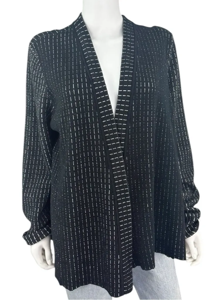 Reversible black and white stretch knit casual jacket with long sleeves and an open front. Jacket i... Show more