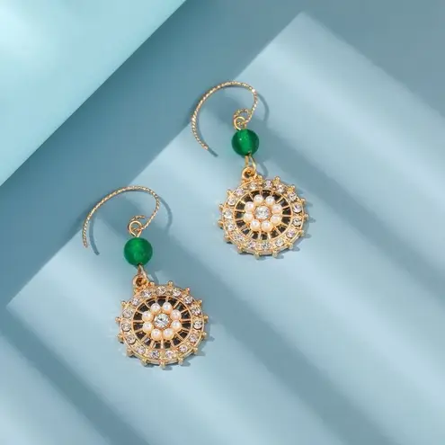 Elegant Gold Green Bead Crystal Drop Earrings | Pearl Sunburst Design NWT • Statement drop earrings with intricate gold-tone sunburst design • Features green faux jade bead and crystal-studded circular pendant • Centered pearl flower cluster surrounded by clear rhinestones • Lightweight and eye-catching, perfect for festive or elegant wear • Pierced earrings with curved twisted hooks • Size approx. 4 cm long (see photo with ruler)