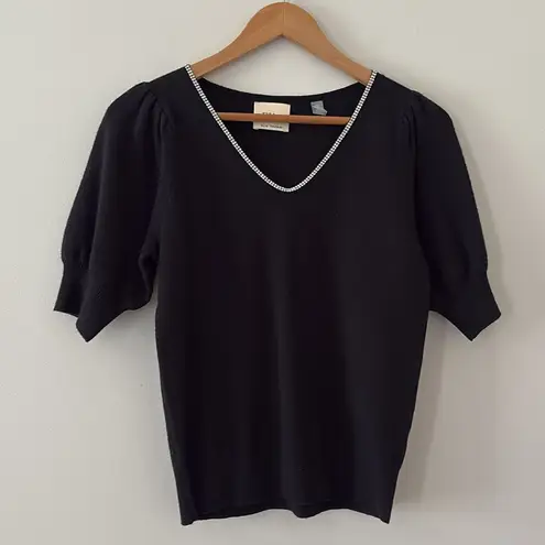 Elie Tahari Rhinestone Edged V Neck Sweater Pleated Puff Short Sleeve Black S - $27 - From D