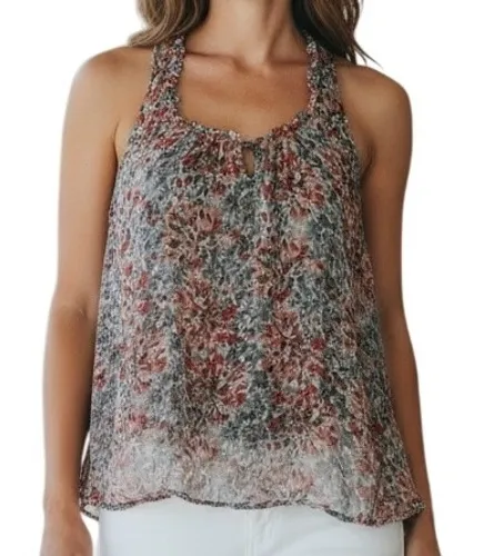 Excellent Pre-Owned Condition Scoop Neck Ruffles Around Entire Neckline Small Opening Front With Button Fuller Straight Bottom Hem Floral Pattern in Red, Pink, Whte and Gray Lining is Gray 100% Silk - Lining 100% Cotton Dry Clean Size Small Armpit to Armpit 28" - 30" - Shoulder to Hem 24 1/4" All items are measured lying flat