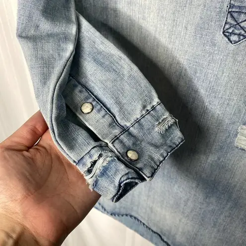 en creme denim Snap Button Down Distressed Chambray Tunic Top. Excellent preowned condition, no flaw... Show more