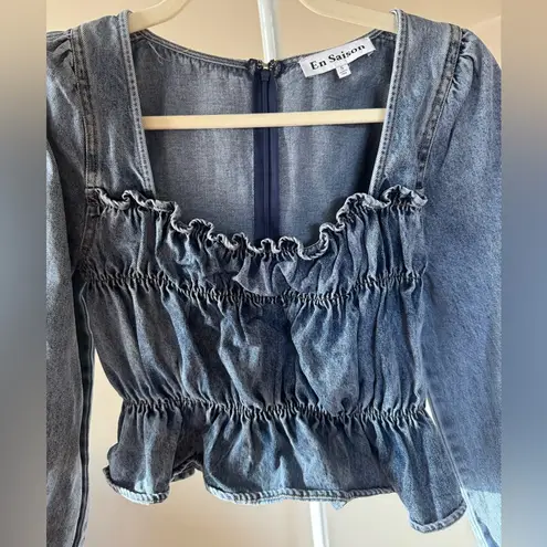 En Saison Ruffled Rouche Denim Blue Jean Blouse Long Sleeve Top - L - $60 - From Stephanie