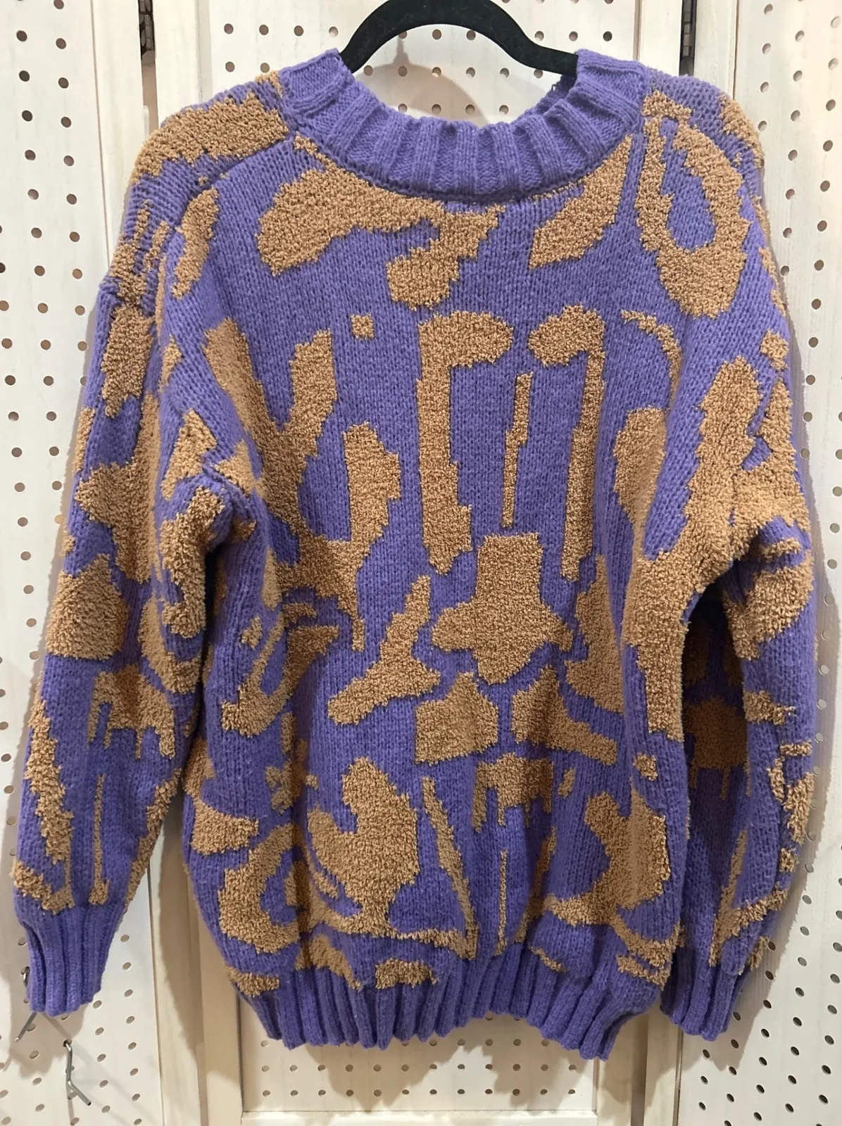 Like new! A knit pullover sweater in purple with a tan abstract pattern. This cozy knit features a... Show more