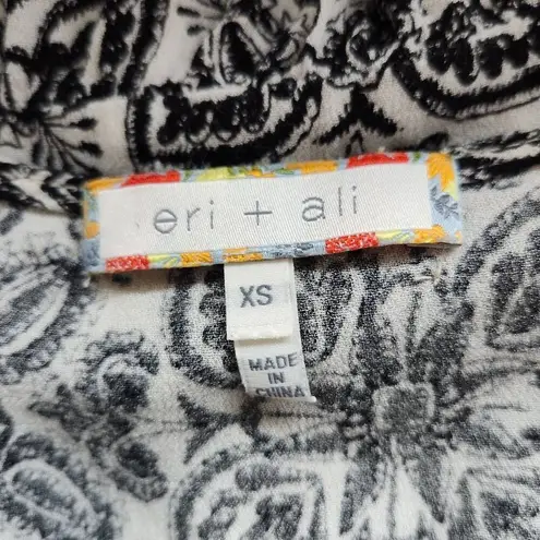 Anthropologie Eri + Ali flowy blouse. 3/4 sleeve top features a v-neck and crochet details. Material is lightweight in a black and off-white print. Full bell-sleeves and full cut at hemline. Great condition! Make me an offer! Measurements are approximate and taken while laying flat: Length 22" Bust 18“ pit to pit SKU0223-38-B6a