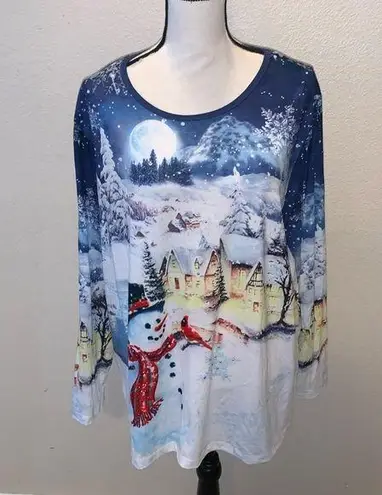 Erika winter scene snowman cottage sequined long sleeve top Blue Size 1X - $26 - From Kathryn