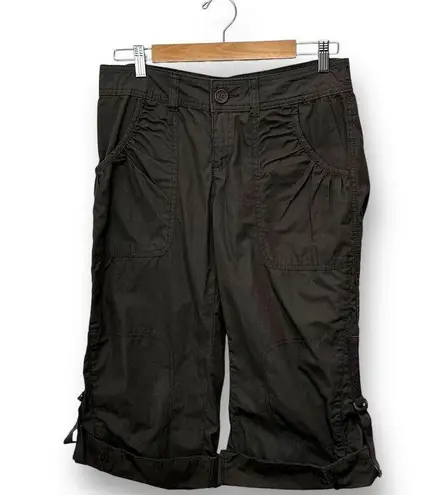 These Esprit women's capri pants in size 8 are crafted from 100% cotton, offering a breathable fit. The solid black color and regular fit make them suitable for casual occasions. They feature a drawstring waist, two side pockets, and are made in Pakistan. The pants are machine washable for easy care. Condition is pre-owned.