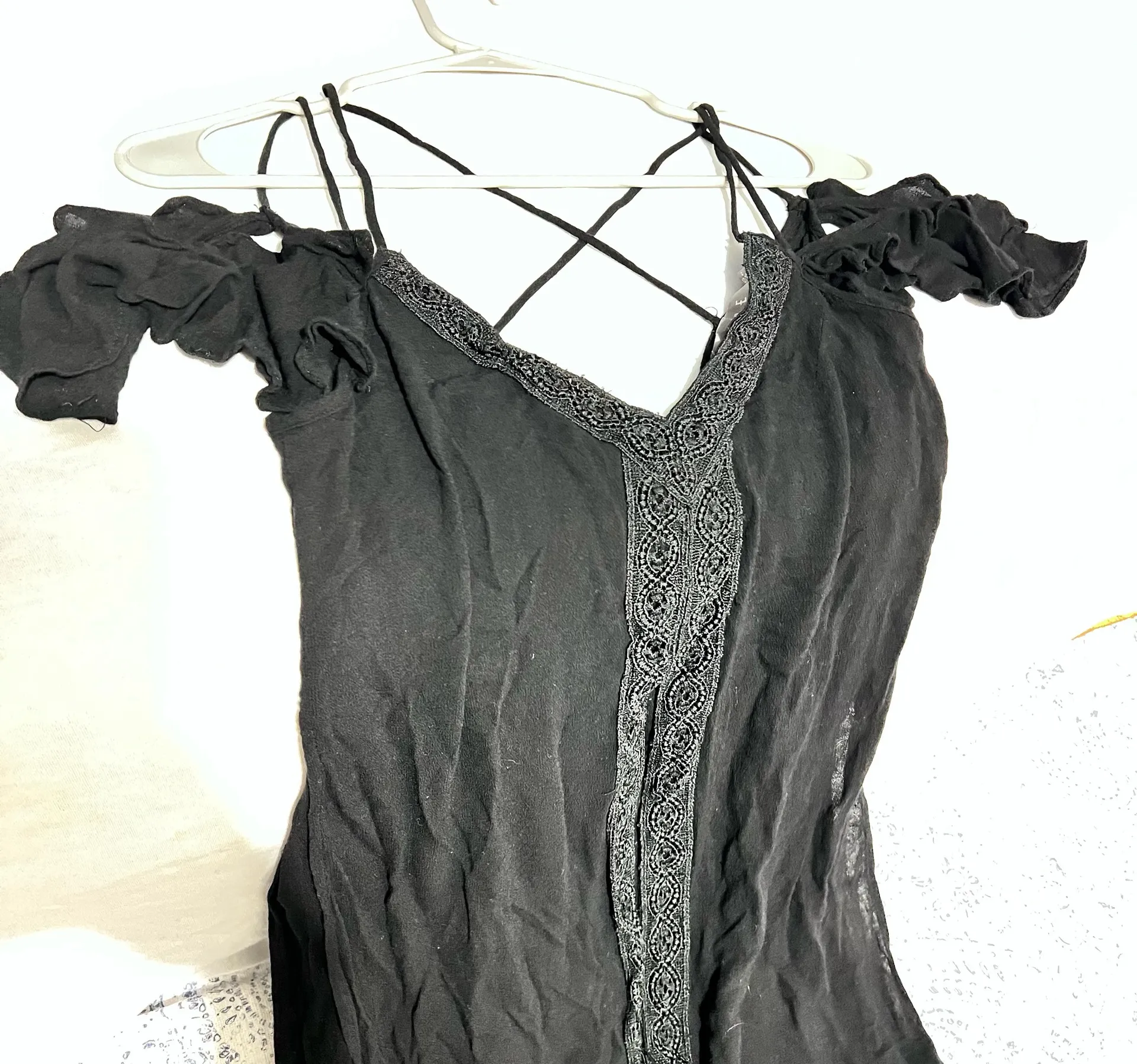 Black lace trim tank top with tie back #goth #grunge This is a black off-the-shoulder maxi dress with a split front and strap detailing. ESSUE dress size S Pre loved: good condition no flaws