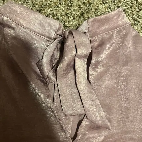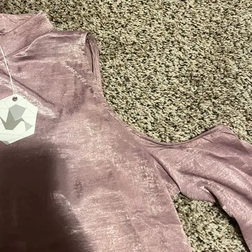 Elegant cold shoulder top in a lustrous mauve shimmer fabric. Features a sophisticated mock neckline and long sleeves with cutout details at the shoulders. Perfect for evening events, parties, or dressy casual occasions. The shimmering finish adds a glamorous touch while maintaining comfort. New with tags, in pristine condition. Keywords: cold shoulder, mock neck, shimmer, mauve, ethereal, evening wear, party top, dressy casual, cutout shoulders, long sleeve, metallic, feminine, holiday, glamorous