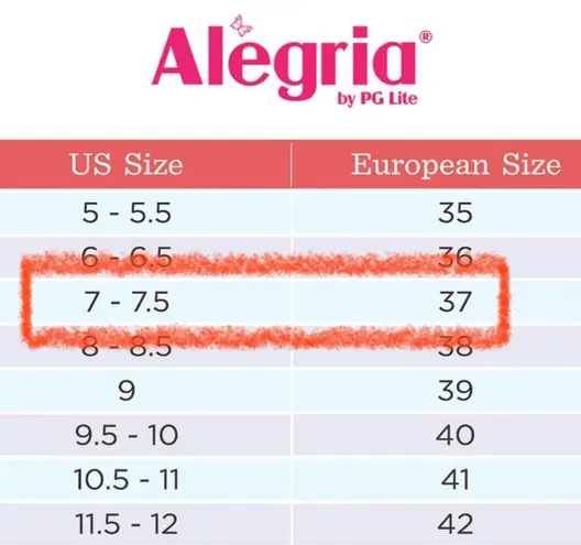 Excellent pre-loved condition; Rust red leather uppers with tonal embroidery; faux fur lining; cushioned footbed; Alegria size 37 which is equivalent to a size 7 - 7 1/2; smoke free home. d