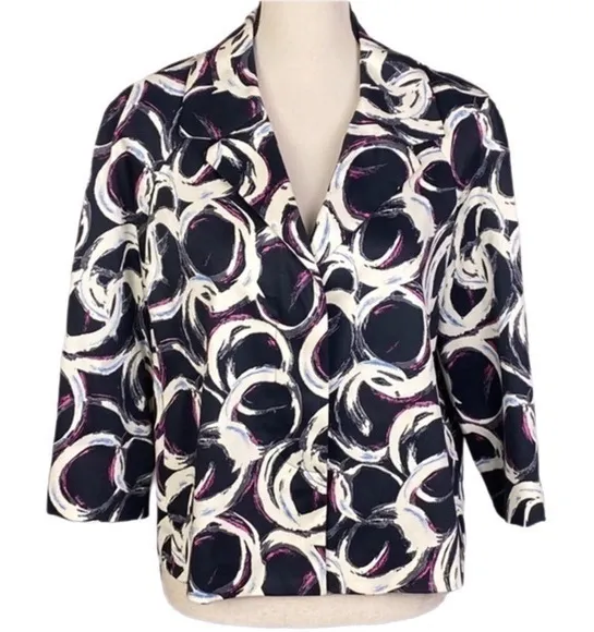 This Evan Picone blazer has such pretty colors- it’s black with abstract circle chains in off-white/... Show more