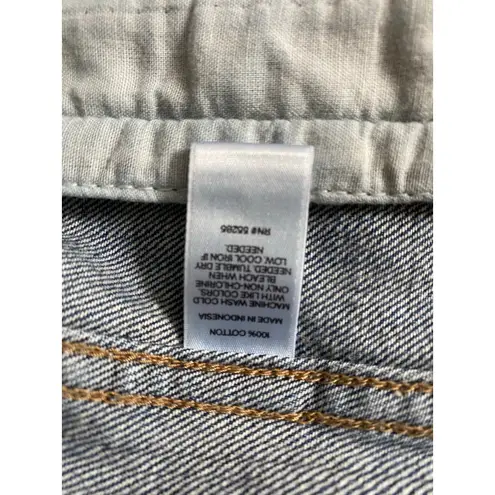 Trendy and casual denim jacket by Express Jeans featuring a unique mixed-media design. Blue distress... Show more