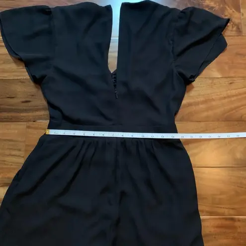 Black Express Short Romper Keyhole/cutout in middle with short flowy sleeves and pockets Lining insi... Show more