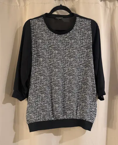 Elegant blouse with a black and white pattern. Features a relaxed fit and round neckline. The back a... Show more