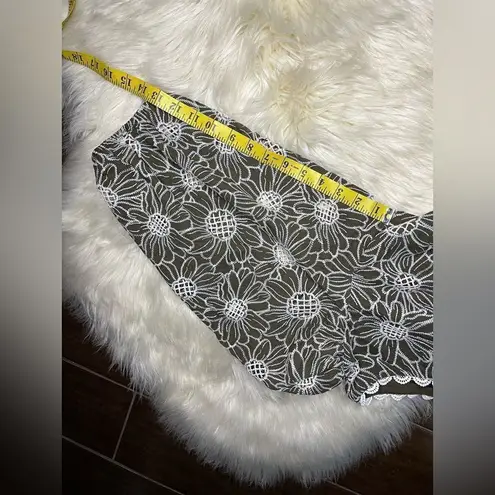 Express olive green/beige embroidered eyelet floral design Crew neck Scalloped trim details 3/4 len... Show more