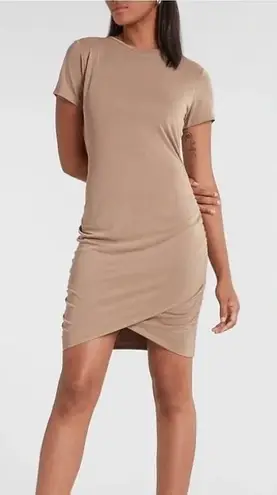 Tshirt dress featuring slight ruching/scrunch in front for a flattering fit. Light brown/tan color.... Show more