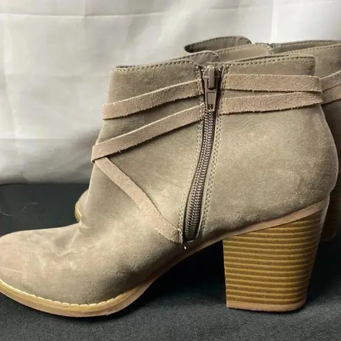EXPRESS WO SIZE 9 TAN SUEDE LOOK ANKLE BOOT 3”HEEL INSIDE ZIPPER CRISS CROSS RIBBON ACCENT GOOD CLEA... Show more