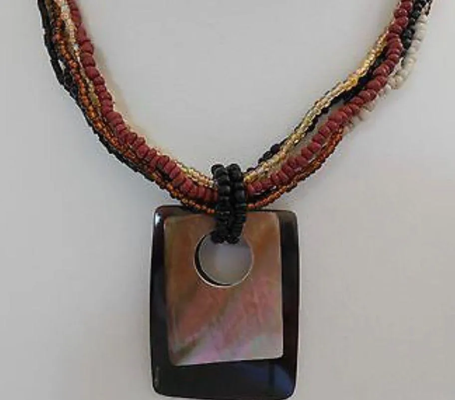 BEAUTIFUL MULTI-STRAND BEADED NECKLACE WITH SHELL PENDANT BLACK, BROWNS, BEIGE, COPPER & GOLD SEED... Show more
