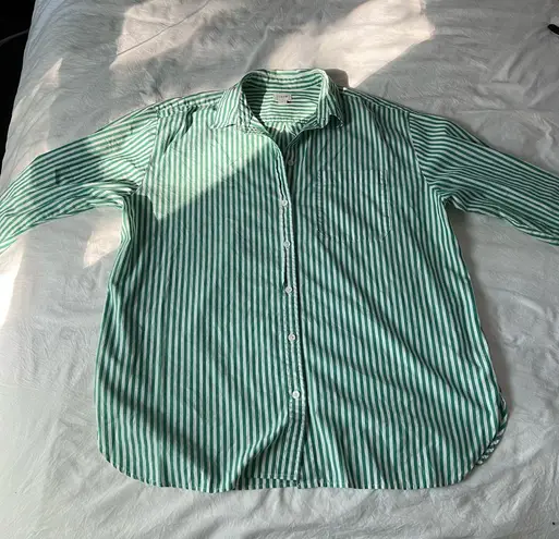 Chic button-down with green and white stripes. Ideal for versatile styling. Oversized fit