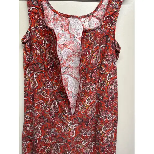 A vibrant red tank dress adorned with a detailed paisley print. This sleeveless dress features a sco... Show more