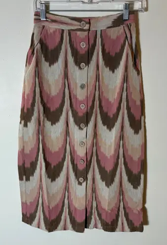 Embrace artisanal charm with this Faherty midi skirt, a canvas of captivating ikat-inspired print in earthy tones of rose pink, warm brown, and soft beige. Designed for effortless movement and comfort, the skirt features a flattering button-front detail that cascades down, complemented by a comfortable elasticized waistband at the back for a perfect fit. Side pockets add a touch of practicality to this uniquely crafted piece, making it ideal for a leisurely weekend brunch or a stylish day exploring a new city. Type: Skirt Style: A-Line Skirt Length: Midi Department: Women Material: Cotton Pattern: Geometric Accents: Button Fabric Type: Canvas Features: Pockets, Lightweight Theme: Tribal, Bohemian Closure: Button Rise: Mid Occasion: Casual Season: Spring, Summer, Fall Garment Care: Machine Washable Country of Origin: India Keywords: Faherty skirt, ikat print, button front, elastic waist, midi skirt, bohemian, artisanal, linen blend, lightweight, casual, resortwear, travel, summer, spring