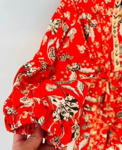 As any other Farm Rio exquisite pieces, this romper simply stands out! This charming piece is designed with long balloon sleeves, button front closure, ruffled detailing at waist and side slant pockets, showcasing a gorgeous floral print in bright red color. Defined by its relaxing fit and flattering oversized sleeves, it creates a playful yet poised silhouette perfect for sun-drenched days and spirited nights. Embrace the artistry and comfort that this unique creation offers. 100% cotton Size S Pit to pit 10” Waist 15.5” elasticized Length 31.5” Inseam 3.5” NWT! Check out my other listings including: #Free People# Zara # Farm Rio #Anthropologie # Sezane#25120725 Casual romper Trendy romper Everyday romper Cozy romper Semi elegant comfy romper Designer romper Spring romper Summer romper Twee Chic Regency Glam Emily in Paris Dynasty Designer jumpsuit Stylish Glam Feminine Modest