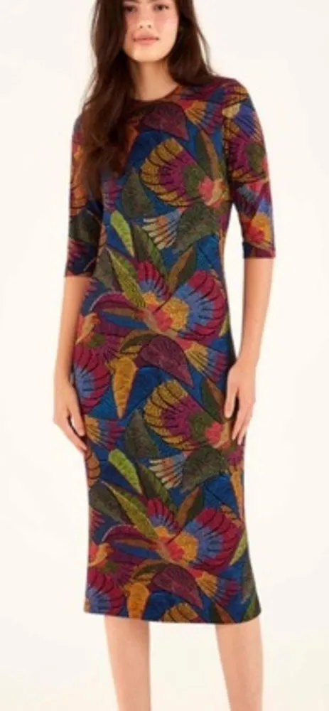 Colorful Farm Rio midi-length bodycon dress. Three-quarter sleeve with boat neck. Exposed zip closure at back. Fabric: 95% Viscose, 5% Elastane Excellent condition! Size small 15.25” pit to pit 46” length 14.25” waist 1336-11