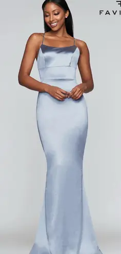 Scoop Neckline Satin Dress With Lace Up Back FAVIANA S10375 size 2 Style: faviana_S10375 Fabric: Stretch Satin Details: Spaghetti Straps, Wide Empire Waist, Backless, Lace Up Back, Back Zipper Closure, Back Godet, Sweep Train Length: Long Neckline: Straight-Across Waistline: Empire Silhouette: Mermaid Never worn no tag Purchase from dress store that was closing