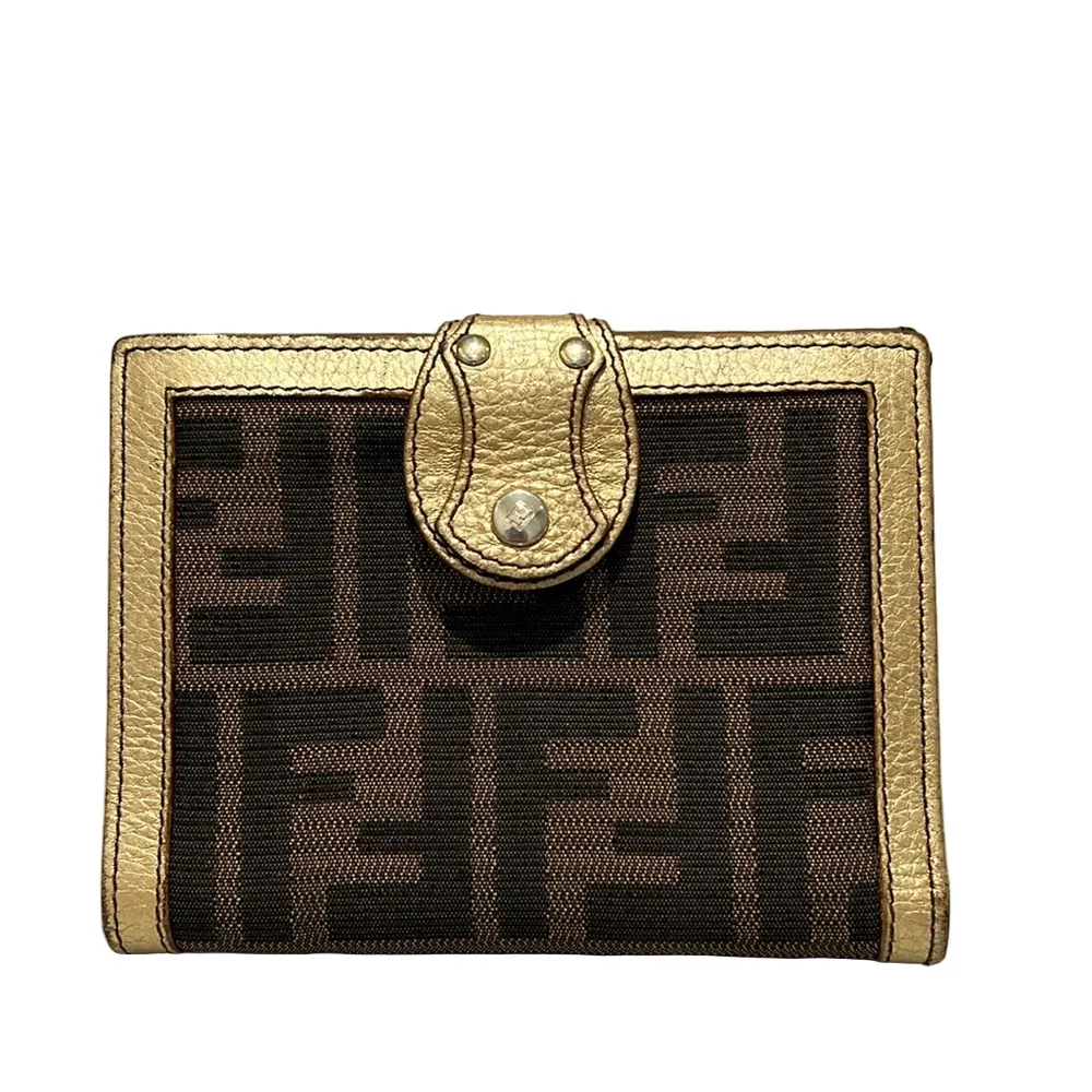 Beautiful Fendi Zucca compact wallet with gold trim. Main callout is an area on discoloration on the... Show more