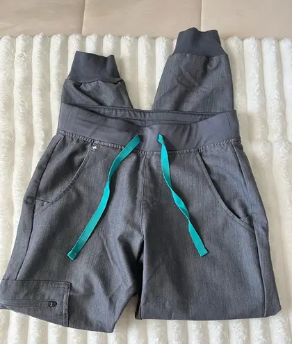 Comfortable gray jogger pants with teal drawstrings. Ideal for casual wear. Size xxs Figs Jogger... Show more