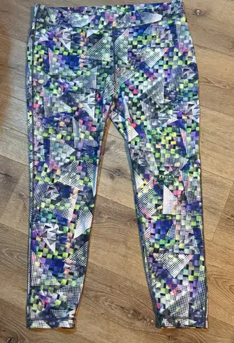 Fila leggings with a bold geometric pattern. Features a mix of black, white, green, and purple.