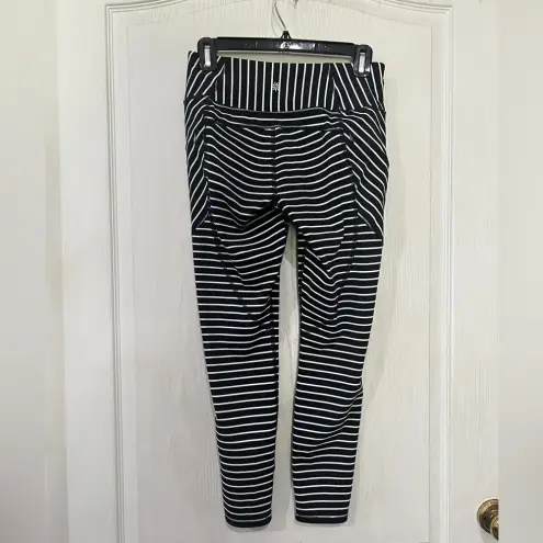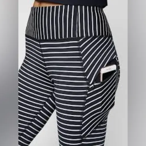 A dark navy blue and white colors Striped pattern all over Has great stretch Zipper compartments... Show more