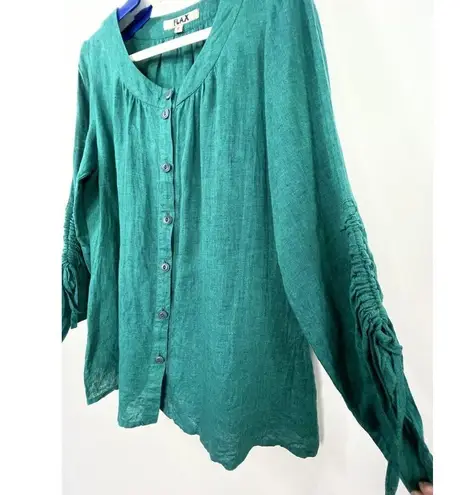 Flax Button Front Shirt Top Tunic Linen Green Lagenlook Ruched Sleeves. Drawstring on sleeves to a... Show more