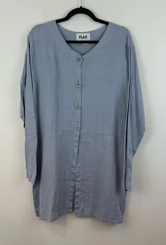 Excellent used condition light gray linen top. Tunic length. Button down to the hip length, and then it opens up. Elegant Flax top in light gray. Crafted from 100% linen. Comfortable and stylish. Items come from a smoke free and pet friendly home. Please don’t hesitate to ask any questions you might have!