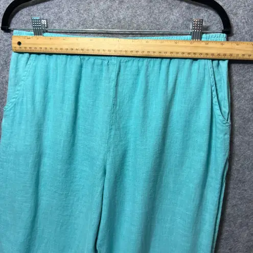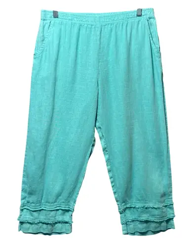 Lightweight 100% linen crop pants from Focus Casual Life in a bright aqua color. Features a comfortable pull-on elastic waistband, side pockets, and a feminine tiered ruffle hem. Preshrunk linen with a soft, breathable feel — perfect for warm weather, travel, beach days, or casual everyday outfits. Keywords: teal pants, linen blend, cropped trousers, ruffle hem, elastic waist, casual, breathable, preshrunk, summer, resort wear, relaxed fit, capri pants, lightweight Note: All items are pre-owned with minor wear expected. Major flaws shown. Measurements are approximate.