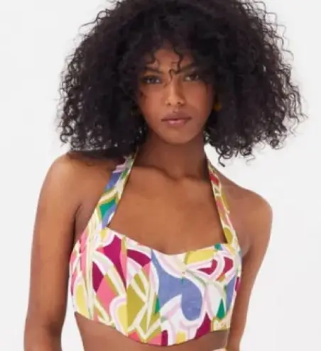 NWT • sold out • has boning and an adjustable halter tie around the neck • abstract print • size med... Show more