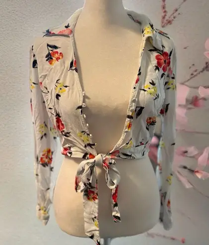 Chic floral button-down with tie-front. Features vibrant floral patterns. Perfect for casual outings... Show more